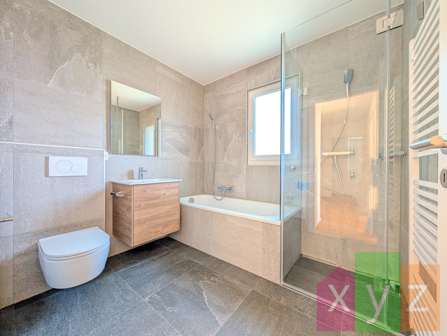 - une belle salle de bain intemporelle équipée d'une douche et baignoire, d'un sèche-serviette, d'une fenêtre et d'un enclos pour une colonne de lavage privée